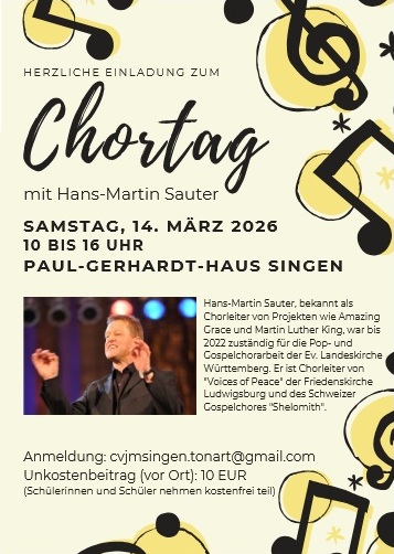 Lass dich einladen, gemeinsam mit vielen anderen Singbegeisterten und unter Leitung von Hans-Martin Sauter in die Lieder aus der neuen Chormappe 2026 einzutauchen und zu üben. In den Pausen ist mit Mittagessen, Getränken, Kaffee und Kuchen für das leibliche Wohl gesorgt.