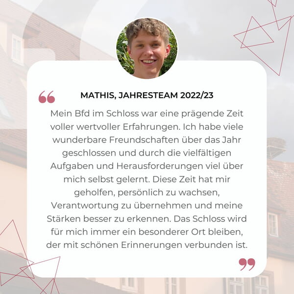 "Mein Jahr im Schloss war mit das prägendste in meinem Leben. Ich habe dort ein zweites Zuhause gefunden, tiefe Freundschaften geschlossen und herausgefunden, was ich beruflich machen möchte. Für mich ist es ein Ort, an dem ich immer wieder gerne bin und an dem ich mit offenen Armen empfangen werde."